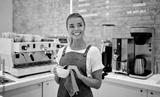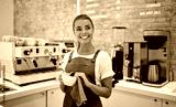 A beautiful woman barista dressed in an apron washes a cup with a rag behind the bar in a coffee shop.