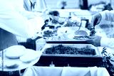Close up of bridal party dishing up catered buffet food at casual outdoor wedding