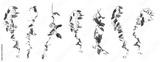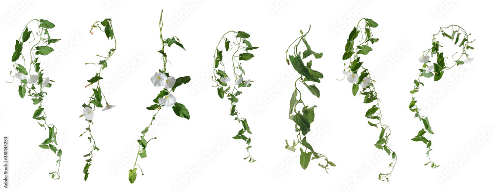 Few stems of bindweed with white flowers and green leaves at various angles on white background