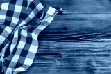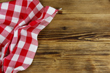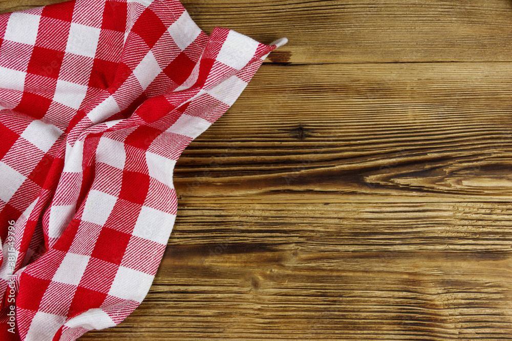 Red folded checkered napkin on rustic wooden kitchen table. Top view, copy space