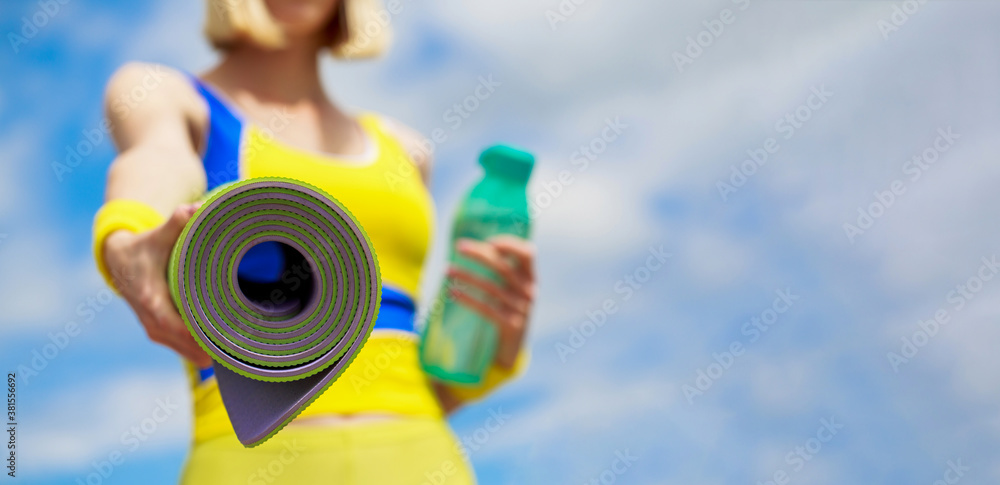 Yoga mat and water bottle. Fitness girl with yoga mat over sky background. Woman in sports wear is holding a yoga mat and a bottle of water. Healthy lifestyle concept. Copy space