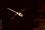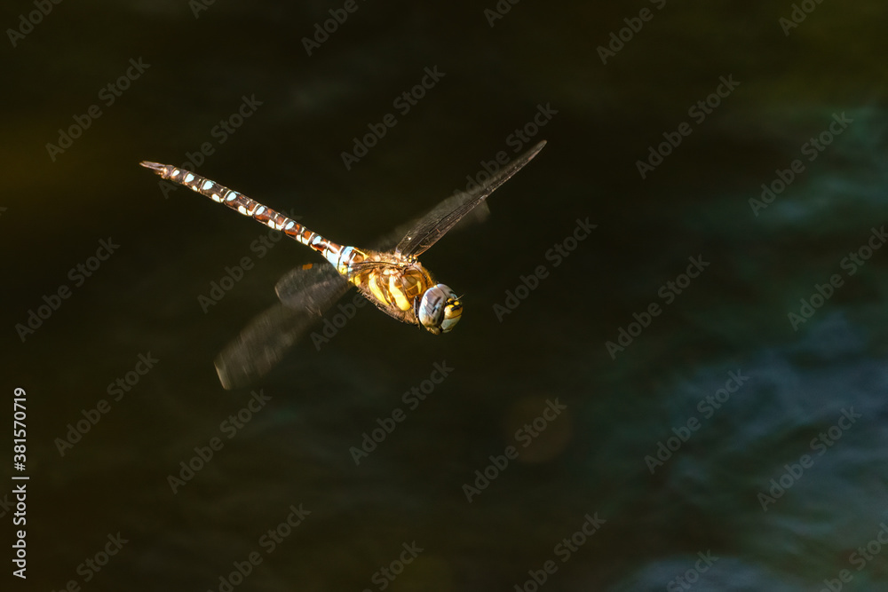 Migrant hawker (Aeshna mixta) in flight over a pond, taken in the UK