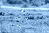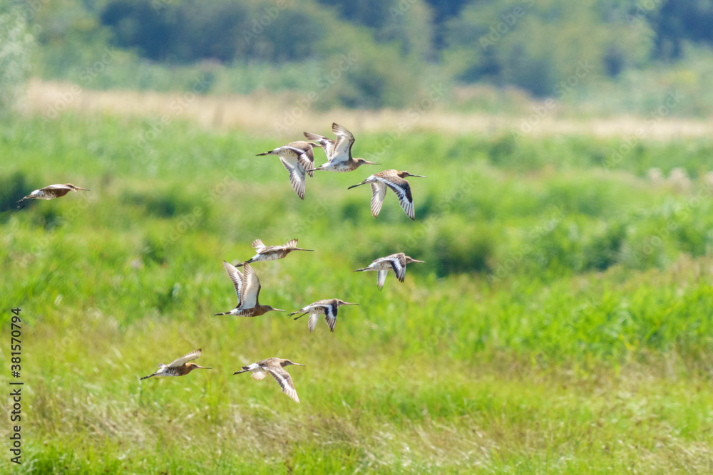 Small flock of Black-tailed Godwit (Limosa limosa) in flight over grassy field, taken in England