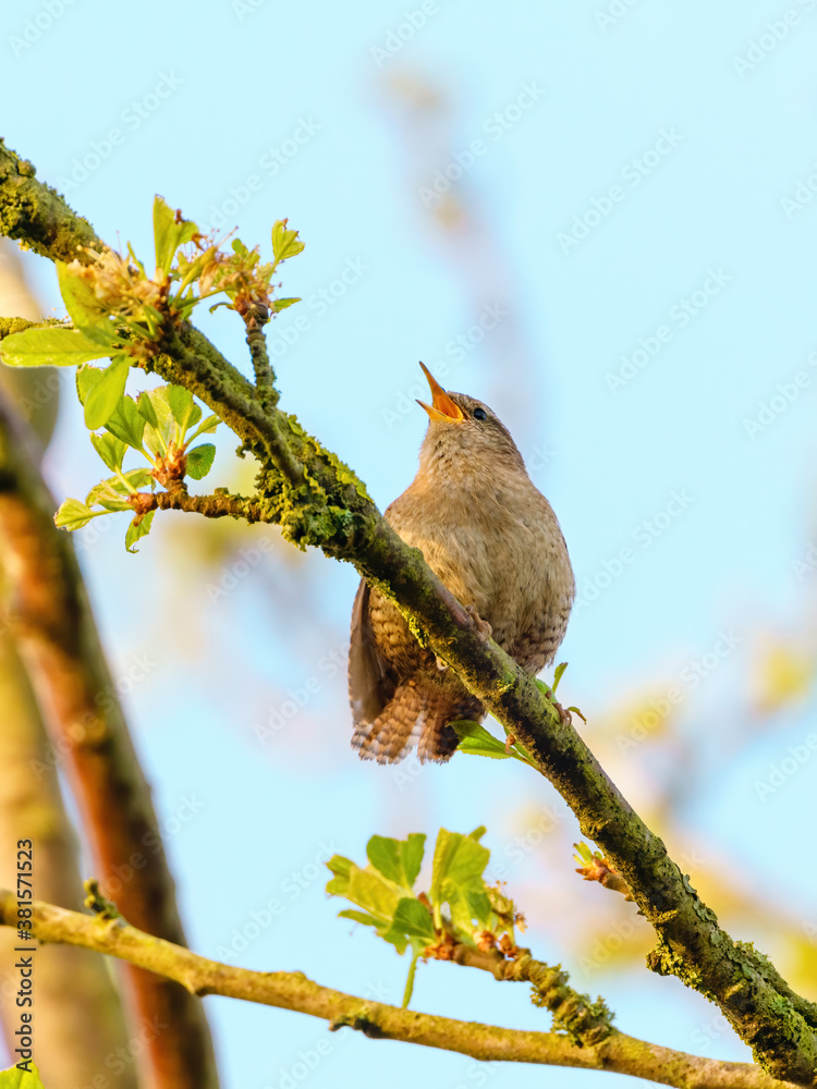 Wren (Troglodytes troglodytes) perched on branch in early morning light, singing, taken in London