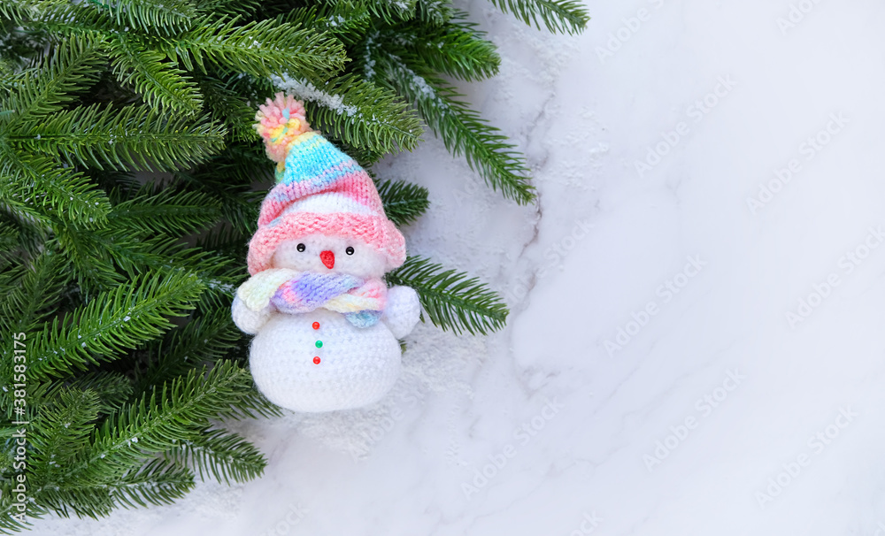Christmas and New Year holiday background. cute snowman and fir tree. winter festive season. flat lay. copy space