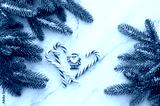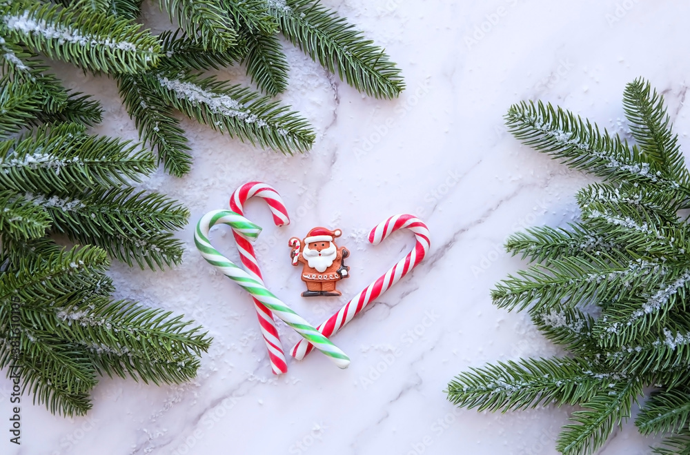 Christmas and New Year holiday background. Fir tree, candy canes and Santa Claus toy on marble background. winter festive season. flat lay. copy space