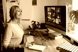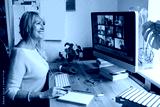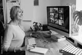 Smiling mature woman having video call via computer in the home office. Online team meeting video conference calling from home. Attractive Businesswoman Telework. Business video conferencing.