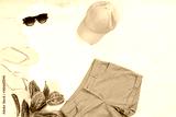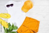 White female t shirt flip flops mock up flat lay on wooden background. Top view and copy space. Mockup t-shirt and summertime. Template blank shirt. Yellow hat