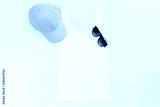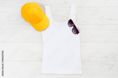 White closeup t shirt mock up flat lay on white wooden background. Top view and copy space. Mockup summer t-shirt and summertime. Template blank shirt.