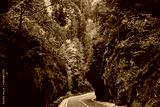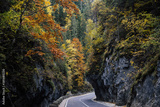 Powerful rockies, road and autumn landscape. Highway at mountains.