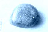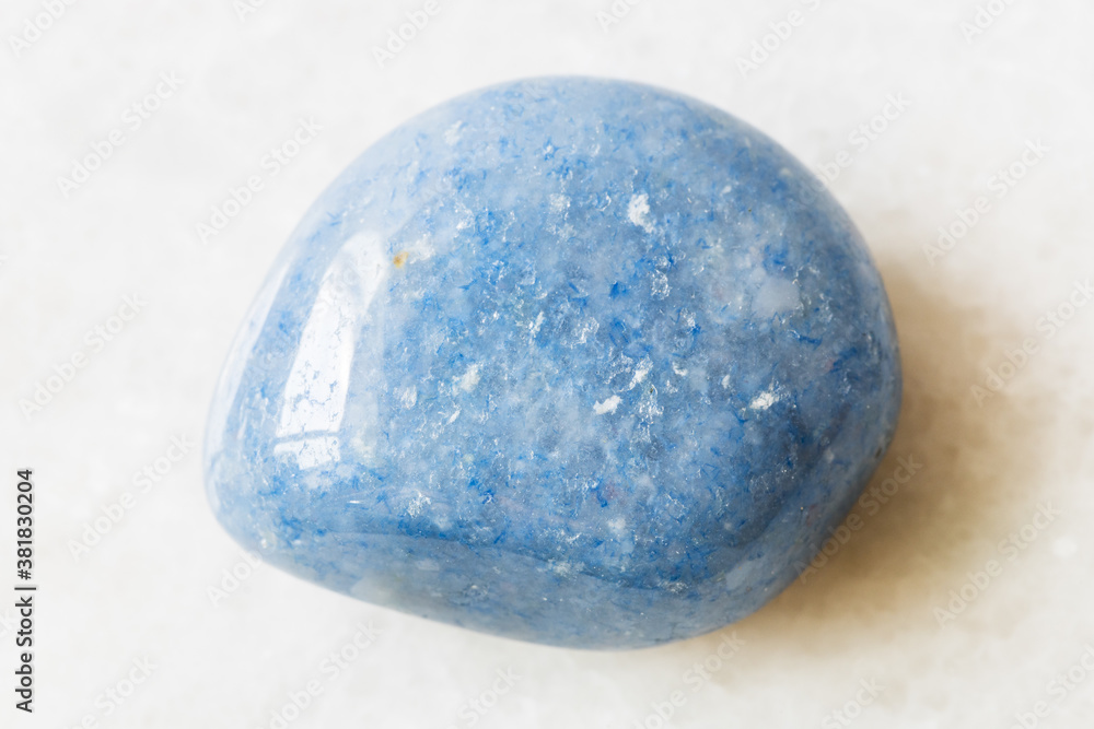 closeup of sample of natural mineral from geological collection - polished blue Aventurine gem stone on white marble background from Brazil