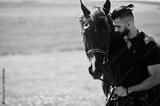 Arab tall beard man wear in black with arabian horse.
