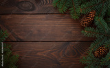 Christmas tree, cones on a wooden brown background.Copy space for your text. Flat lay. New year christmas background