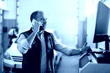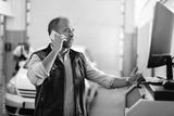 Happy mechanic talking on the phone while using computer at auto repair shop.