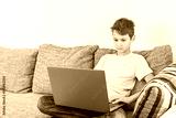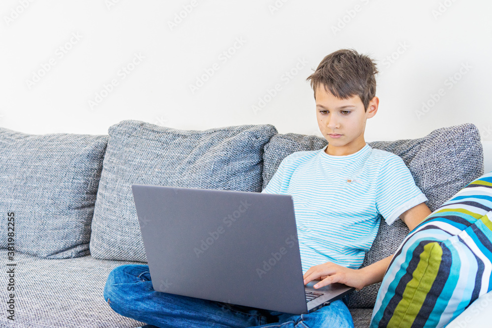 Child using laptop computer at home. Technology, online learning, distance education, home studying, homework, educational games for kids