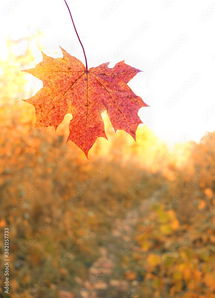 autumn nature background with red maple leaf. fall forest landscape. copy space
