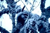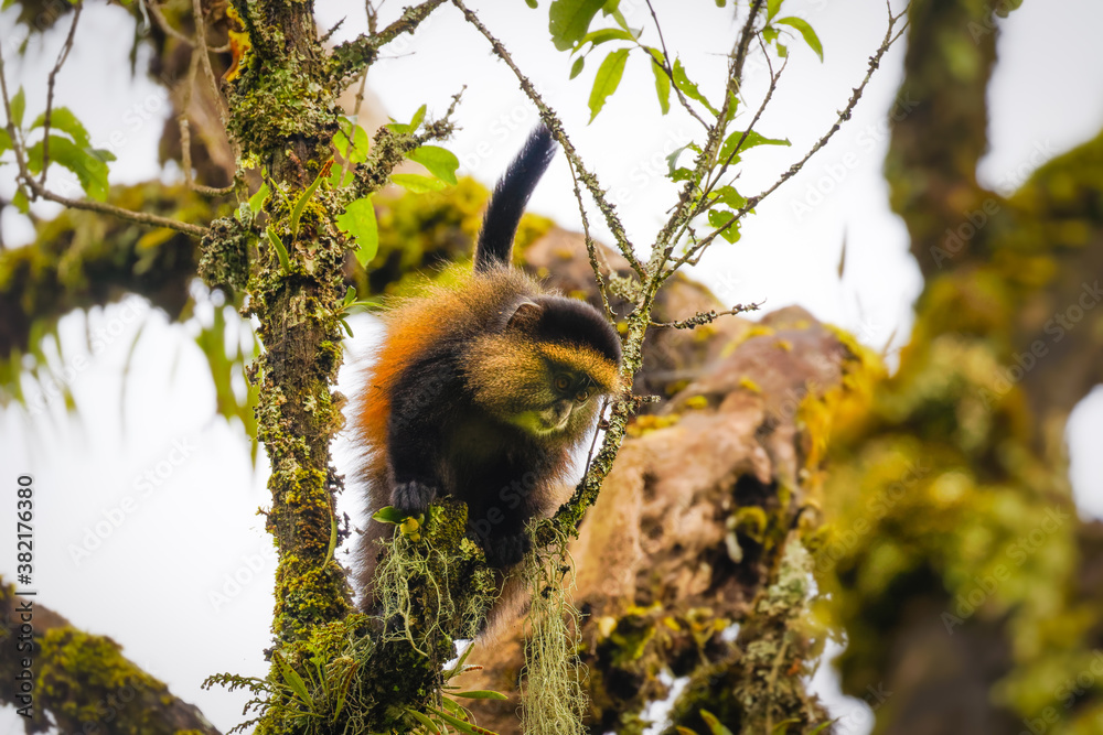 Wild and very rare golden monkey ( Cercopithecus kandti) in the rainforest. Unique and endangered animal close up in nature habitat.