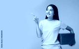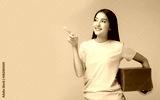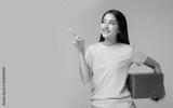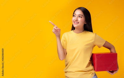 Happy pretty young asian woman holding gift box and point up to copy space, standing over yellow background. Beautiful Asia girl happy smile hold new year gift box present. using for advertisement