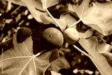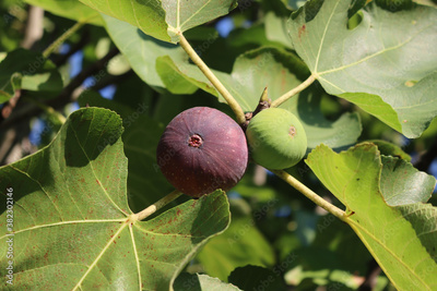 Ripe purple figs on branch in the garden. Ficus carica tree on summer