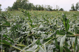 Green Corn field damaged by bad weather on summer. Storm on corn field