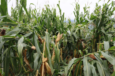 Green Corn field damaged by bad weather on summer. Storm on corn field
