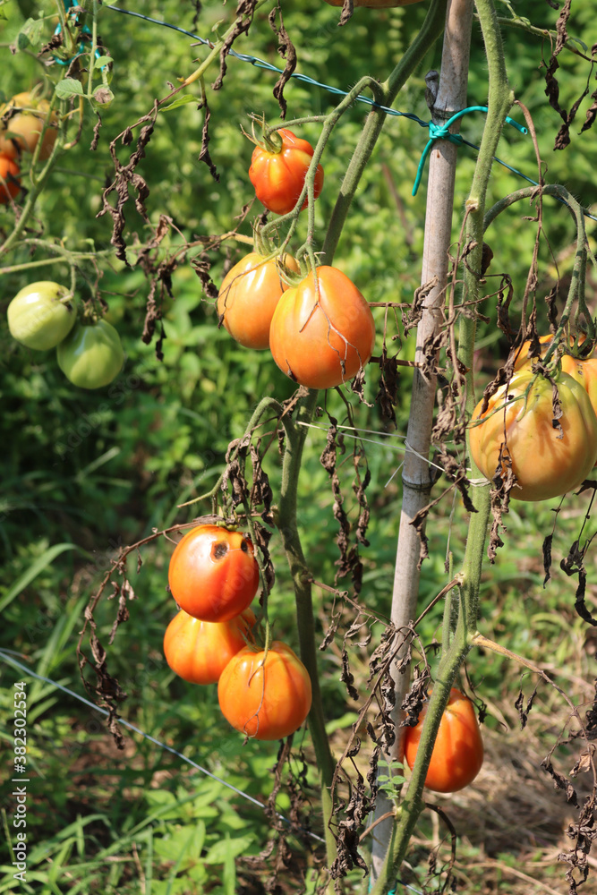 Red rotten tomatoes on plant in the vegetable garden. Tomato plants with disease