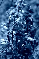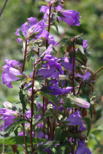 Close-up of purple bell flowers in the garden. Campanula