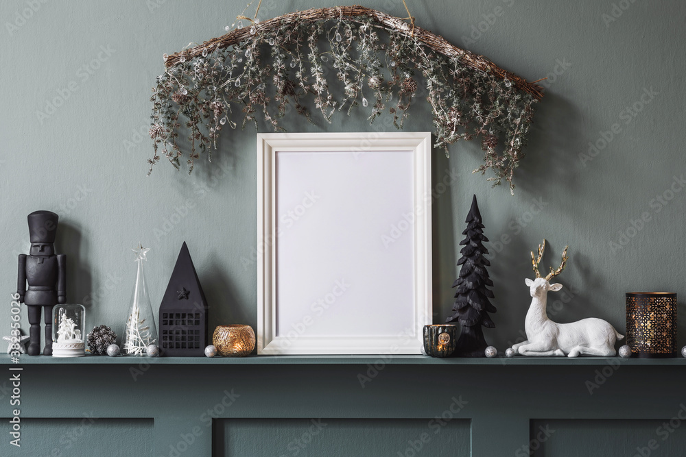 Christmas composition on the shelf in the living room interior with beautiful decoration and Mock up poster frame . Christmas trees, deer, candles, stars, light and elegant accessories. Template.