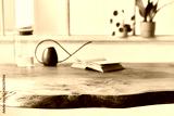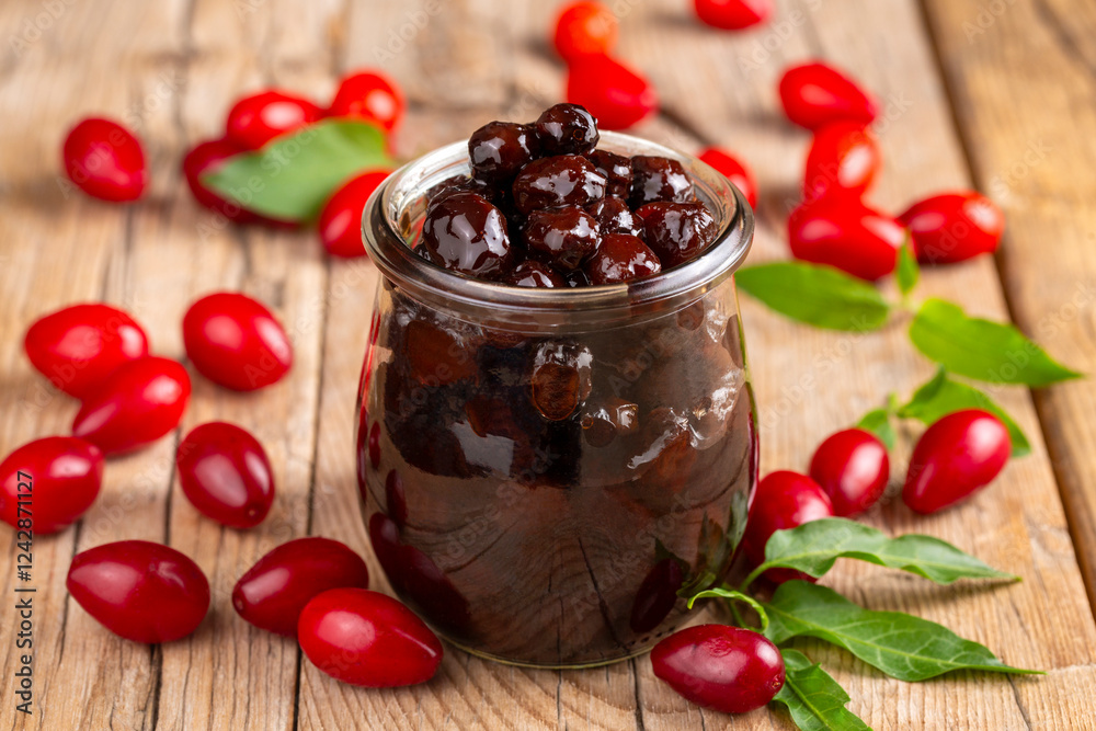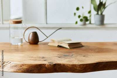 Stylish and cozy compositon of craft oak wooden table with chairs, watering can, glassy jug and modern floor in beautiful interior of design home. Template.