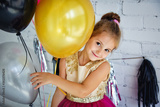 cute little girl with dark hair, in a fancy dress and balloons for her birthday. Child 5 years old