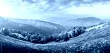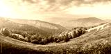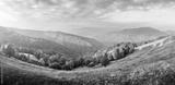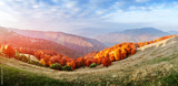 Panorama of picturesque autumn mountains with red beech forest in the foreground. Landscape photography