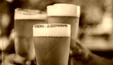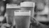 Close-up view of a three glass of beer in hand. Beer glasses clinking at outdoor bar or pub