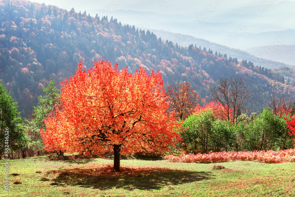 Majestic tree with orange leaves at autumn mountain valley. Dramatic colorful scene. Carpathian mountains, Ukraine. Landscape photography