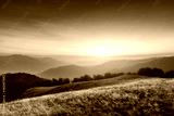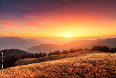 Picturesque autumn mountains with red beech forest in the Carpathian mountains. Landscape photography