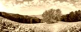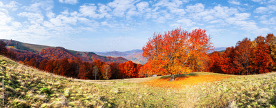 Panorama of picturesque autumn mountains with red cherry tree and orange beech forest in the foreground. Landscape photography