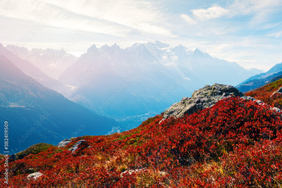 Amazing view on Monte Bianco mountains range with with Monblan on background. Vallon de Berard Nature Preserve, Chamonix, Graian Alps. Landscape photography