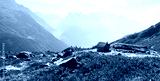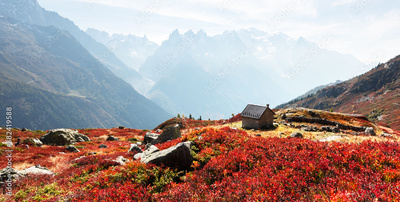 Amazing view on Monte Bianco mountains range with cabin on a foreground. Vallon de Berard Nature Preserve, Chamonix, Graian Alps. Landscape photography