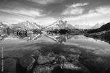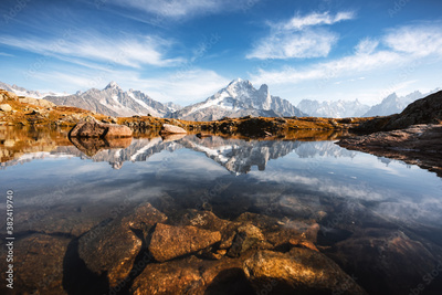 Incredible view of clear water and sky reflection on Lac Blanc lake in France Alps. Monte Bianco mountains range on background. Landscape photography, Chamonix.