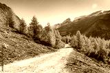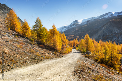 Amazing autumn landscape with road, orange larch forest and snowy mountains on background