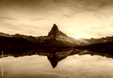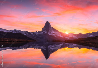 Picturesque landscape with colorful sunrise on Stellisee lake. Snowy Matterhorn Cervino peak with reflection in clear water. Zermatt, Swiss Alps
