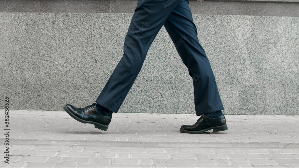 Business man legs walking in black shoes. Closeup black shoes walking outdoor