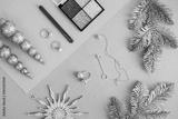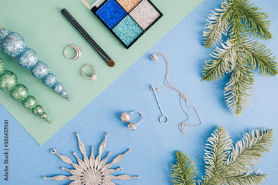 flat lay composition on color background. New year celebration accessories - glitter shadows, silver rings, brush and christmas decor.