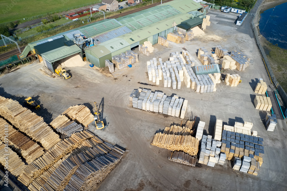 Sawmill aerial view chopped tree wood logs stacks in a row with machinery