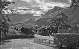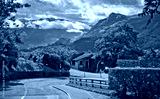 A turning road surrounded by green trees and Alps. Dark clouds over mountains in Vaduz, Liechtenstein