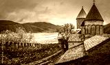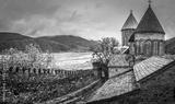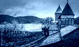 Top view from the Ananuri Castle on its roof tiles and towers with a cross, parched river and green hills in clouds in a summer day, Georgia.
