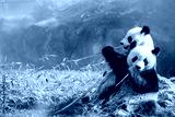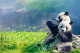 Mother Panda Yuan Yuan and her baby Panda Yuan Meng are Snuggling and eating bamboo in the morning, zoo beauval, France