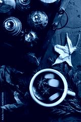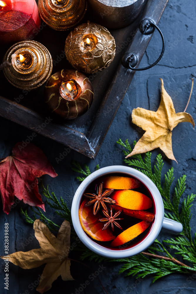 Spicy mulled wine with orange, cinnamon and anise in mug