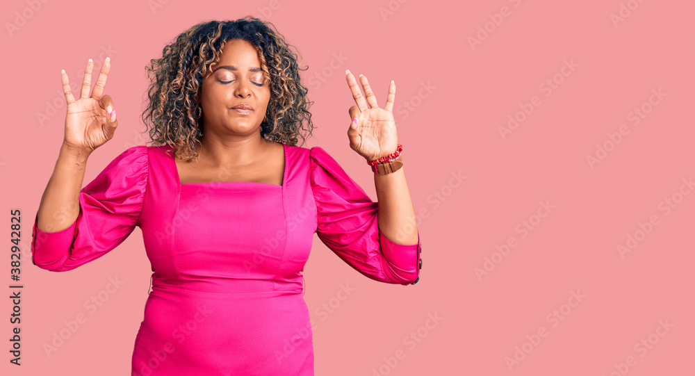 Young african american plus size woman wearing casual clothes relax and smiling with eyes closed doing meditation gesture with fingers. yoga concept.