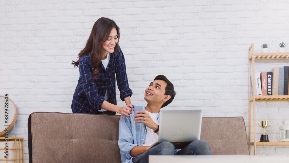 Young Asian couple lover working with laptop together and drink coffee in a room at home background.Concept of freelance couple working with online technology.