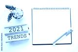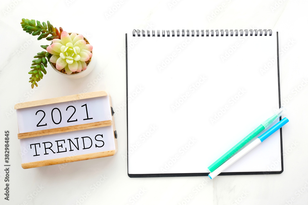 2021 trends on wooden box, Blank paper notebook and pen on white table background, new year business trend mock up, template, copy space for text